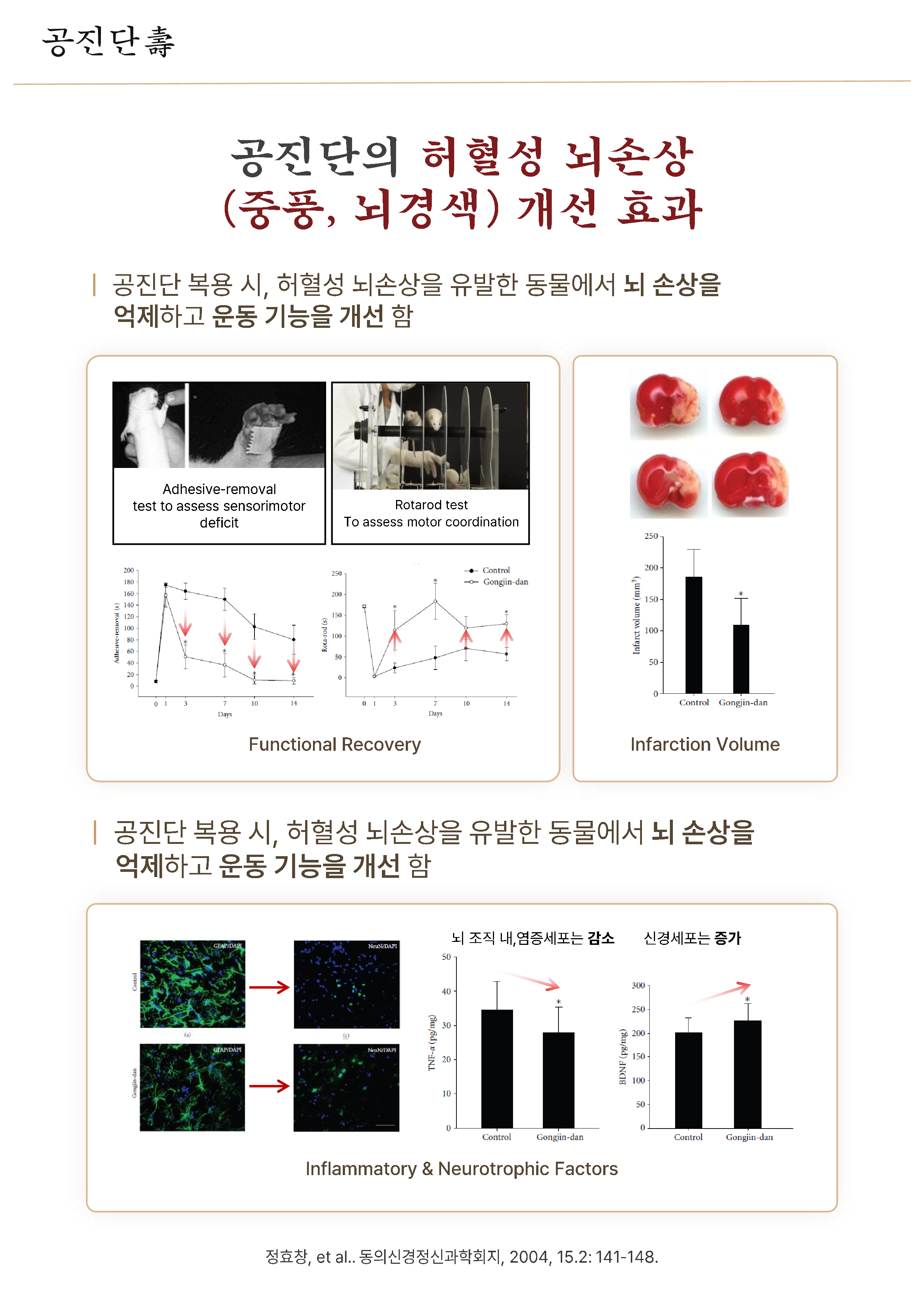 동물실험결과, 허혈성 뇌손상 동물이 공진단 복용시 뇌 부위 염증 억제 &